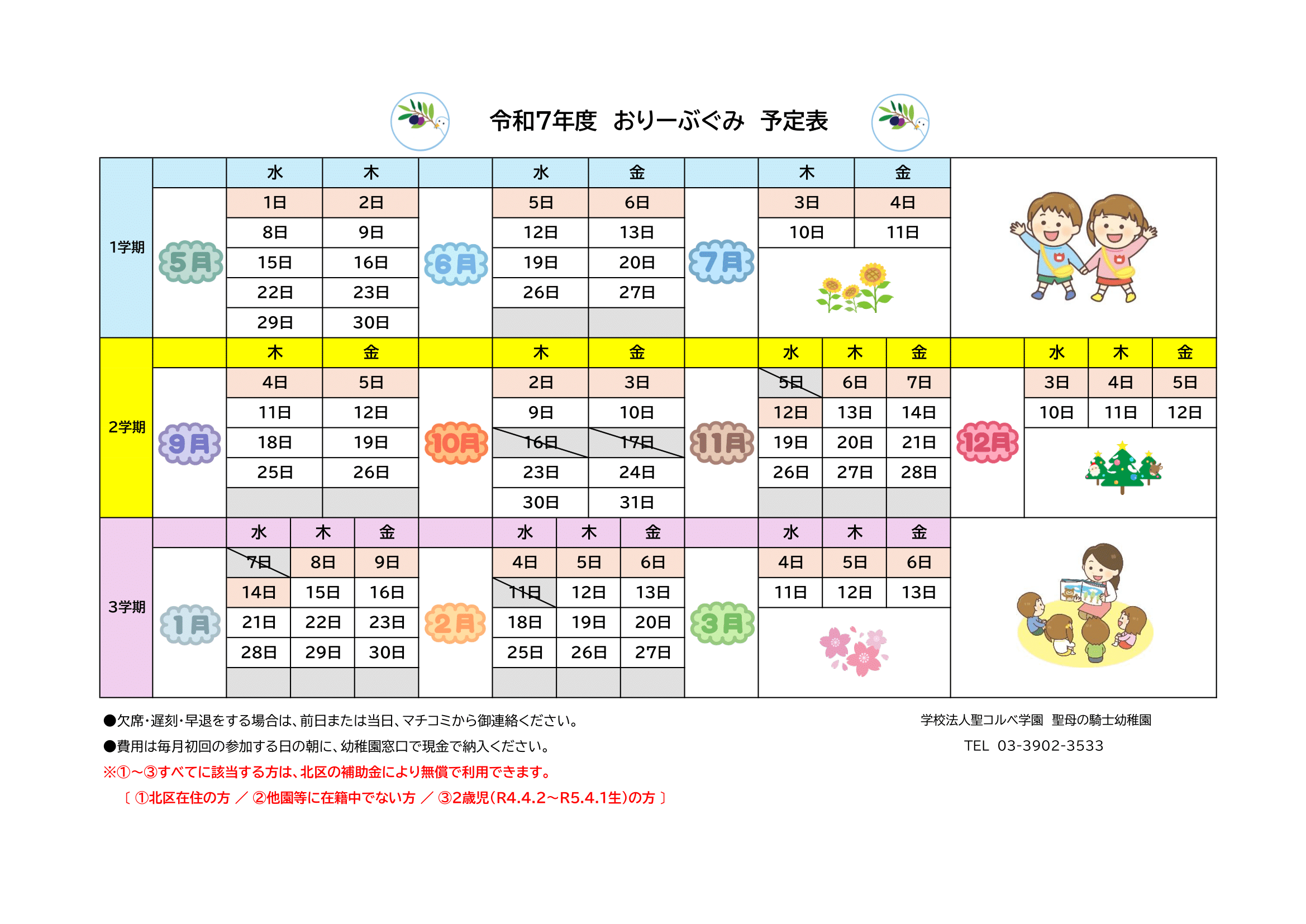 聖母の騎士幼稚園では、子育て支援の一環として「未就園児の会『てんしぐみ』」、「園庭開放・子育て相談」、「子育て講演会」、「未就園児の通園体験クラス・『おりーぶぐみ』」などを行います。どなたでもご利用・ご参加できます。